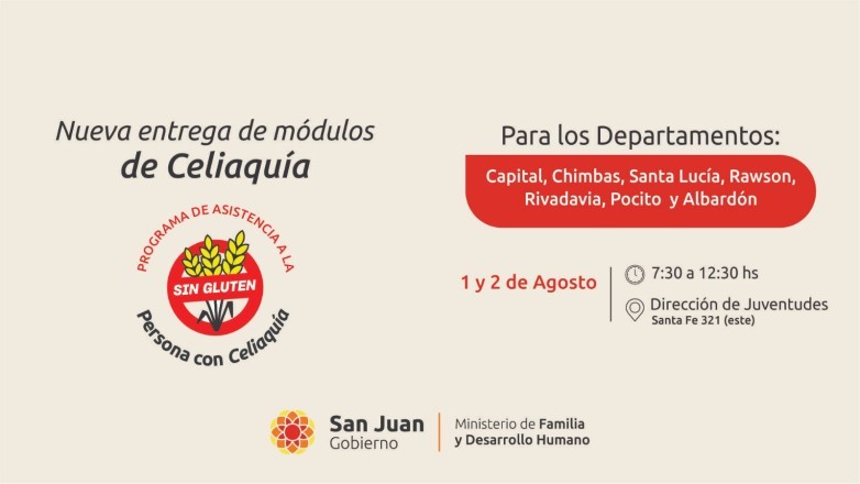 La Dirección de Emergencia y Políticas Alimentarias, dependiente del Ministerio de Familia y Desarrollo Humano, llevará a cabo una nueva entrega de módulos con productos sin TACC, el jueves 1 y viernes 2 de agosto, de 7.30 a 12.30 en la Dirección de Juventudes, ubicada en calle Santa Fe 321 (este).