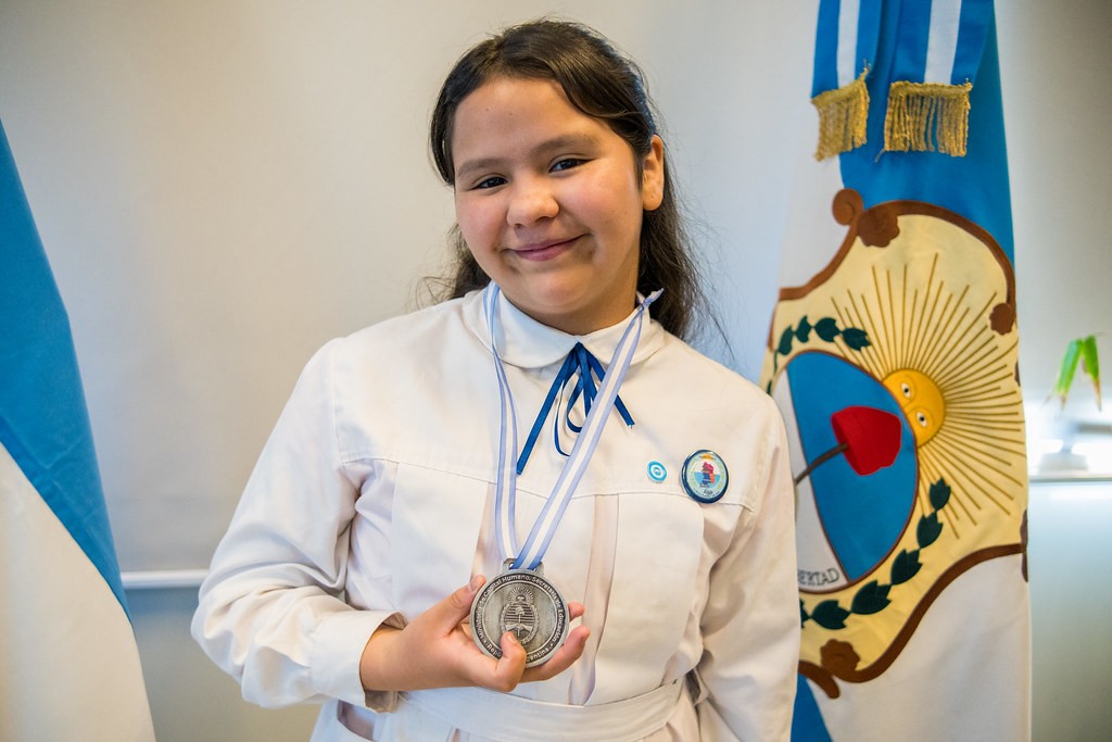 Ingrid Rottis, estudiante de sexto grado de la escuela Nuevo Cuyo, de Rivadavia, recibió una medalla y una mención especial tras su participación en el taller "Desafíos Educativos" de la Feria Nacional de Educación, Artes, Ciencias y Tecnología, organizada por el Ministerio de Capital Humano, a través de la Secretaría de Educación. La alumna fue recibida por la ministra de Educación, Silvia Fuentes, quien la felicitó por el logro.